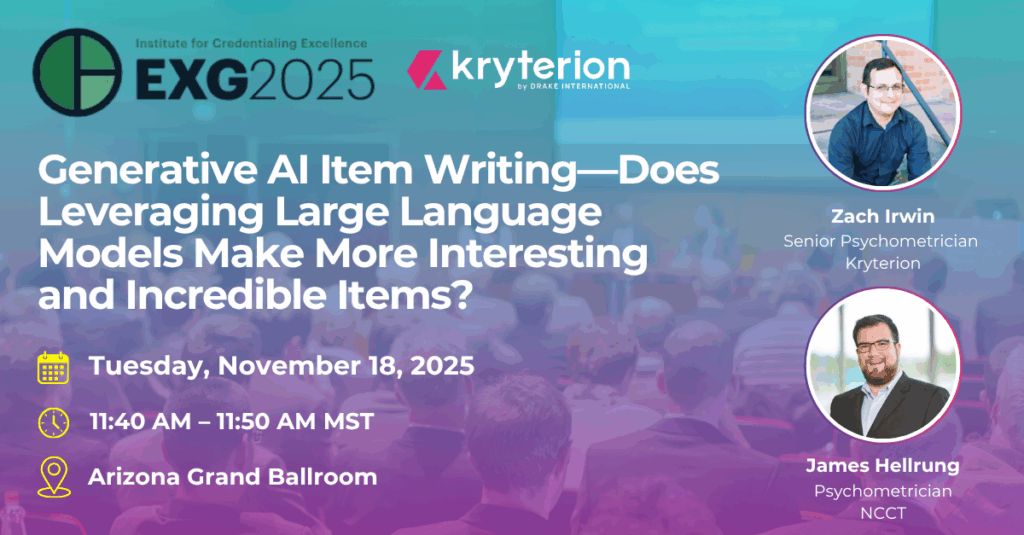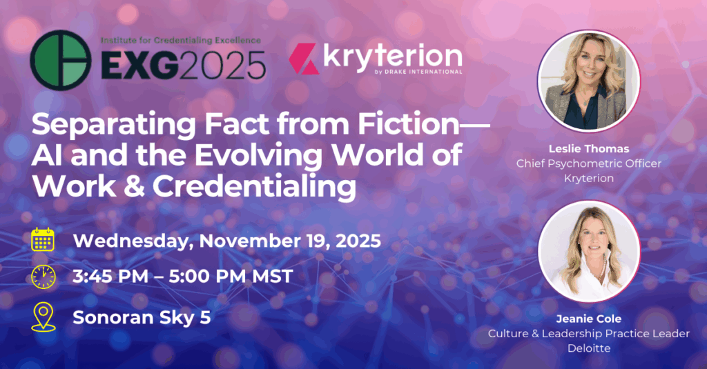 As a global leader in test development and delivery, Kryterion is proud to play a central role in these conversations. This year, our experts will lead three sessions that tackle one of the industry’s most pressing topics: the rise of artificial intelligence and its impact on both the workforce and the future of assessment.