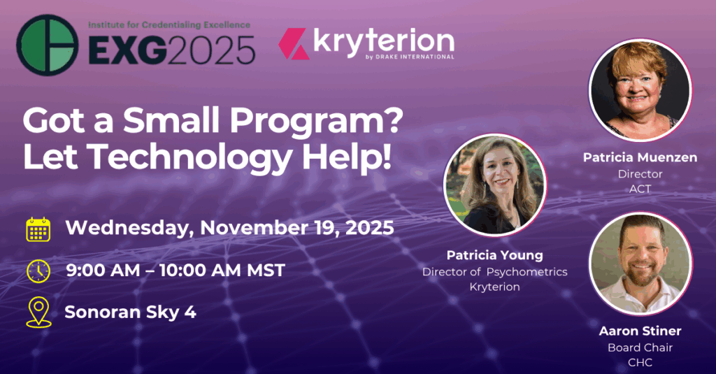 Small credentialing programs face big challenges—from limited staff and volunteers to the need to manage every aspect of exam development and operations efficiently. In this interactive session, Kryterion’s Patricia Young, M.A., joins Patricia Muenzen, Ph.D. (ACT) and Aaron Stiner, CCH, MNpS to explore how small programs can leverage AI and affordable technologies to streamline operations without breaking the budget.