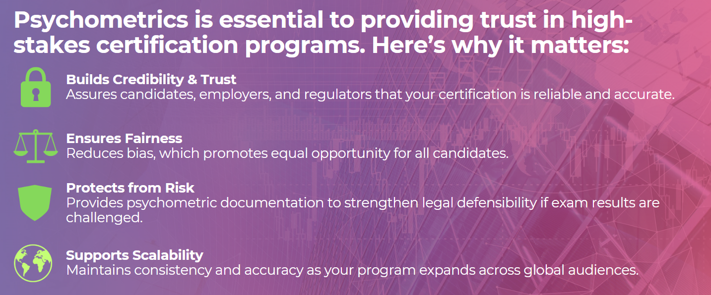 For a high-stakes certification program, psychometrics is essential to build credibility, ensure fairness, and protect from risk.